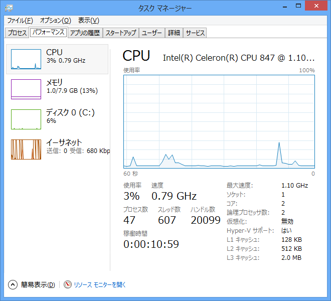 ただ動画再生しているとCPUパワーが足りないのか、Windows8 のデスクトップマネージャの負荷率が15%程度まであがり、Pentium G630Tでは気にならなかった、物足りなさがでてきますね。