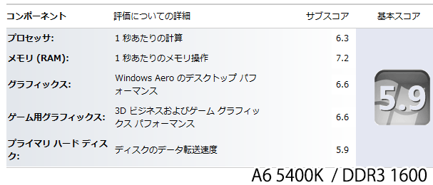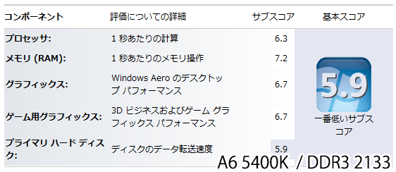ご覧のとおり更にグラフィック関連スコアがアップ。ちなみにIntel HD4000はDDR3 1600で6.6と同スコアだが、WEIはIntelHDグラフィックスを過剰評価する傾向があるのであまりアテにならない。