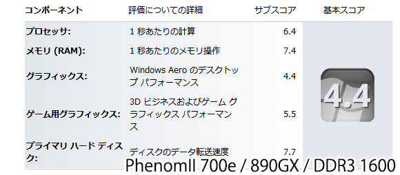 しかしCPU及びメモリのスコアはぱっとしない。同じメモリをIntel Z77マザーに挿すと7.9をたたき出すのにコチラは7.2。また参考として同じくAMD環境のPhenomII X3 700e+890GXマザーのWEI。