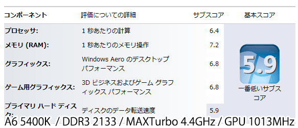 グラフィック系のスコアは6.6とそこそこ高い。これのメモリ設定を2133まで引き上げると…