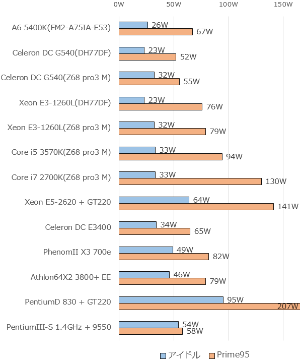 さて、その消費電力を同じ電源で計測した他CPUのデータとも比べてみよう。但し普段のデータは多すぎるので主にオンボード系・低消費電力傾向のものをチョイス。また普段1155環境はM-ATXのASRock Z68 pro3-Mをデータ基準として使用しているのだが、今回はA6 5400KがITXマザーという事で同じITXのIntel DH77DFのデータも一部追加した。