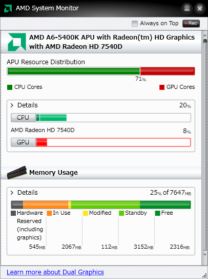↑AMDのサイトからダウンロードできる「AMD System Monitor」。GPUとCPUのどちらに負荷が多くかかっているかがグラフで表示されるのでベンチやソフトでどちらが重視されるかがなんとなく判る。