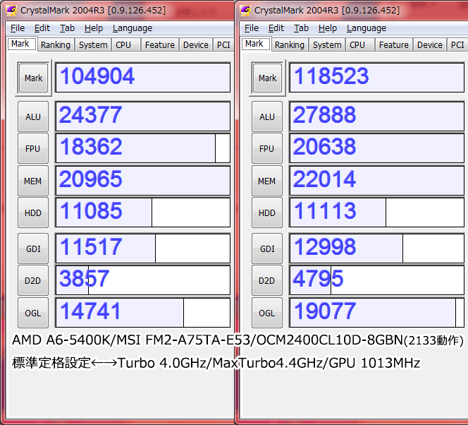 一方CrystalMark2004R3のCPU・メモリ周りのスコアを見る限り、CPU側の性能はWEI通り「それなり」で、3Dmark06のCPUスコアも定格2396pt/OC2598ptとGPU側でフォローしている感が大きい。
