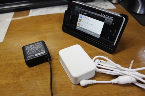 左から、ドコモガラケーユーザーにはお馴染みAC02、AC04、クレードル。新しいアダプタは大きいですね。