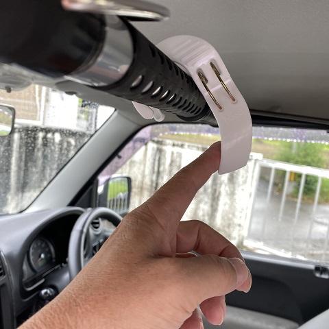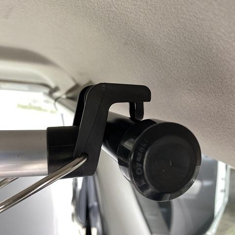 やり方は簡単。買ってきたアームを座席上部にあるグリップに両端乗せて固定するだけ。