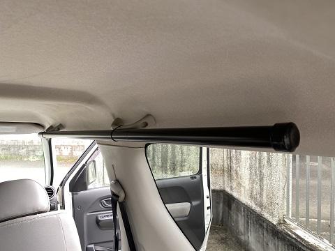前方のアームに取り付けます。アームは運転席と助手席の真上になるのでサドルを下向きには付けれません。頭部と干渉しない様にパイプ上側、天井との隙間に固定。左右は搭乗者の邪魔にならない様に運転席と助手席の間のスペースに取り付けました。