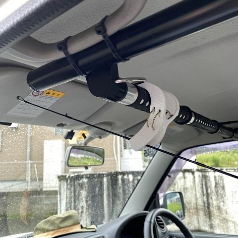 サドルとクリップを並べれば何本もロッドは取り付けできますが、釣りに行くには軽自動車だと搭乗者1~2名ですし2本分準備できれば十分です。予備竿持って行く時にはアームに乗せて水平に縛っておけば邪魔にはならないでしょう。バッチリ。