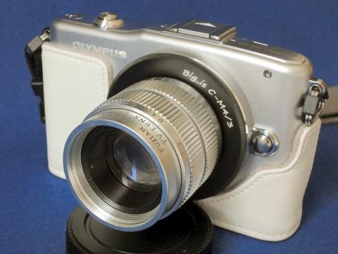 レンズをCマウントアダプターにねじ込み、PENに装着する。