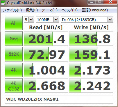 CrystalDiskMark 3.0.3aで速度を計測してみたところ、シーケンシャルリード 200MB/sにスコアが伸びました。