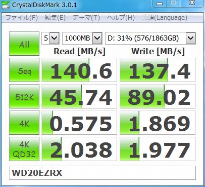 早速換装しデータを移転して、CrystalDiskMarkでベンチをとってみました。
