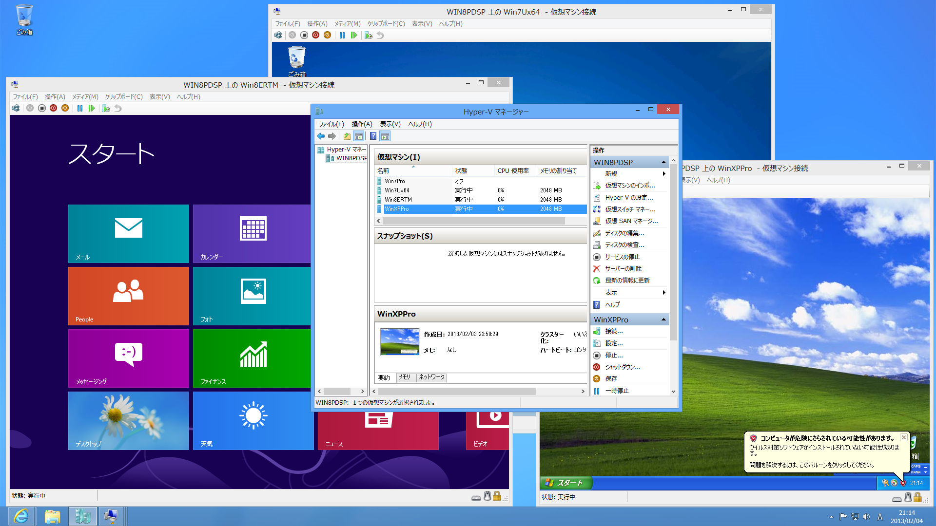 最初はBIOSでCPUの仮想化機能が無効になっていたので有効にしてチェックを入れました。Windows XP、Windows 7、Windows 8を仮想化で動かしてみました。