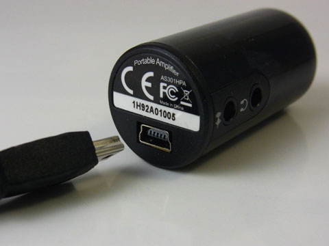 要はUSBで充電して、音楽プレーヤーとイヤフォン・ヘッドフォンの間に挟んで使用するブースター的なアイテム。ミニジャックの大きさから判るように本体は小さい。