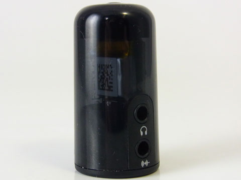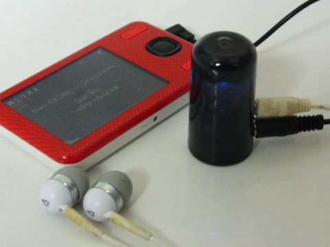 幸い充電しながらの使用もOKみたいなのでとっとと接続してみる。ミニプラグ2個が側面に装着されており、入力側を音楽プレーヤー、出力側をヘッドフォンに接続する。