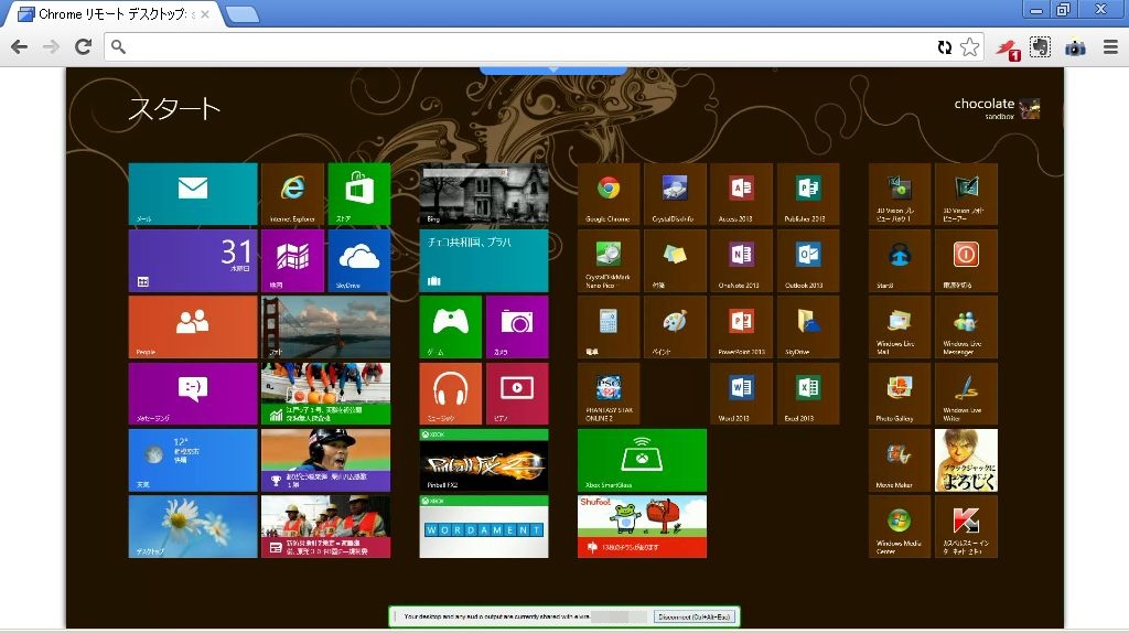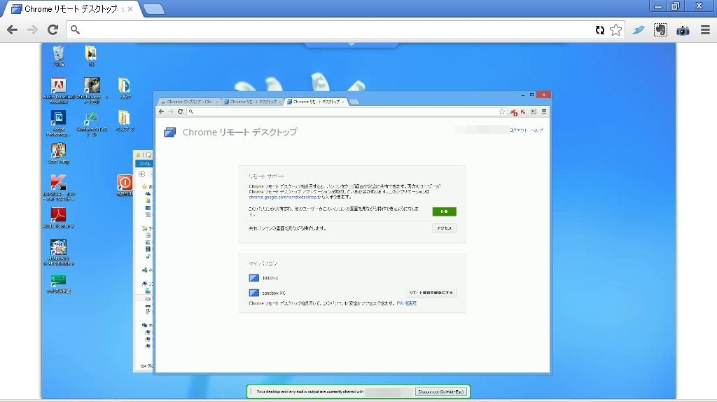 3.暫く経つと、リモートのPCの画面が、Chrome上に表示されます。なんとも不思議な光景。リモート側の画面下部に接続元のアカウントも表示され、リモート側から接続を絶つことが可能です。