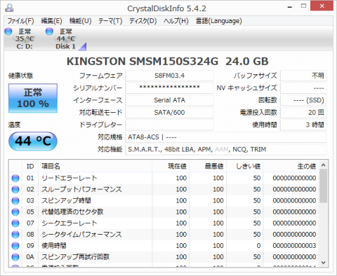 SSDははKingstonのSMSM150S324G、24GB、SATA 6Gbps。