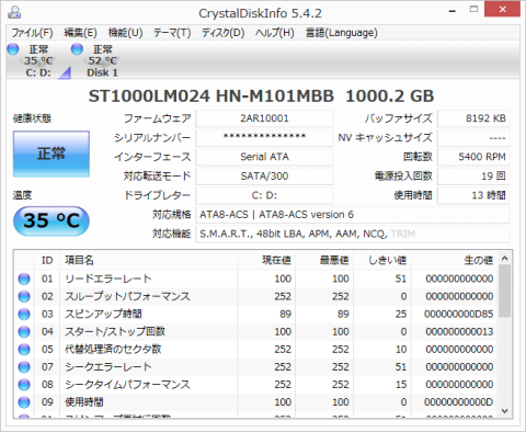 CrystalDiskInfoによると、HDDはST1000LM HN-M101MBB、1TB、SATA 3Gbps、5400rpm。