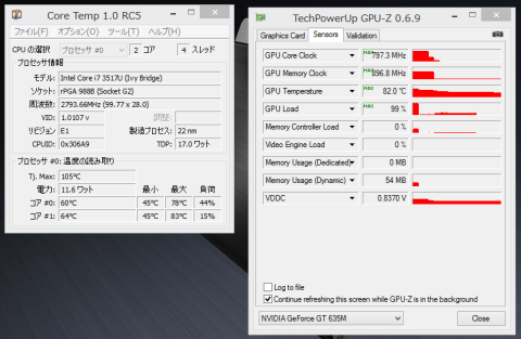 3DMARK起動時のCPUとGPUの温度はともに80度を超えていた。