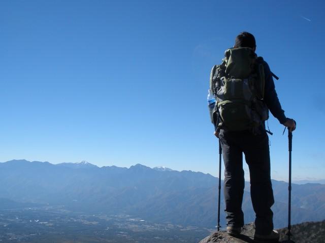 権現岳頂上へ向かう尾根の途中で、南アルプスの山々と記念写真!