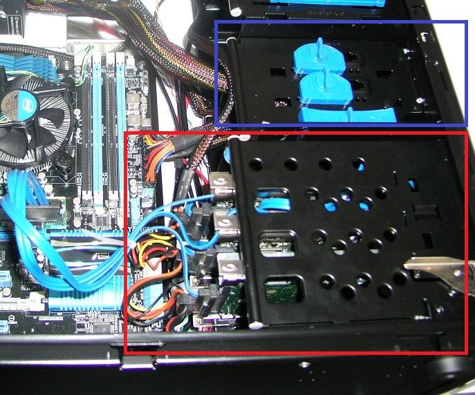3.5ベイ7つのうち、下段の4つ(下図赤枠)はHDD専用で、フロントファンの風が直接当るようになっている。 このHDDベイは真横にスイングさせたり、取り外す事が可能。