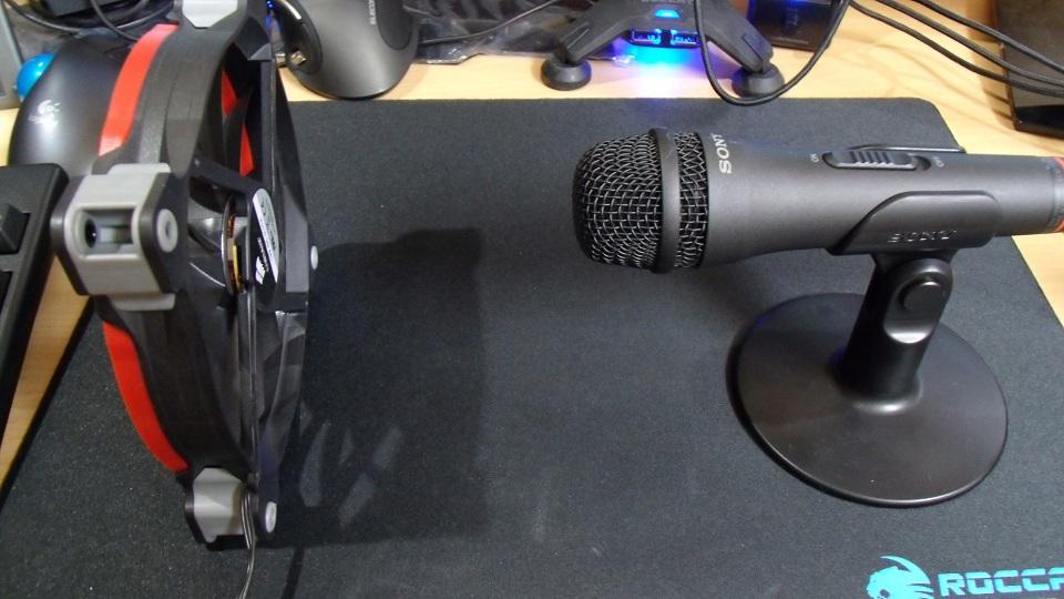 ファンの中心(モーターの軸)から10cmの位置にマイク(SONY ECM-PCV80)を軸に直角に