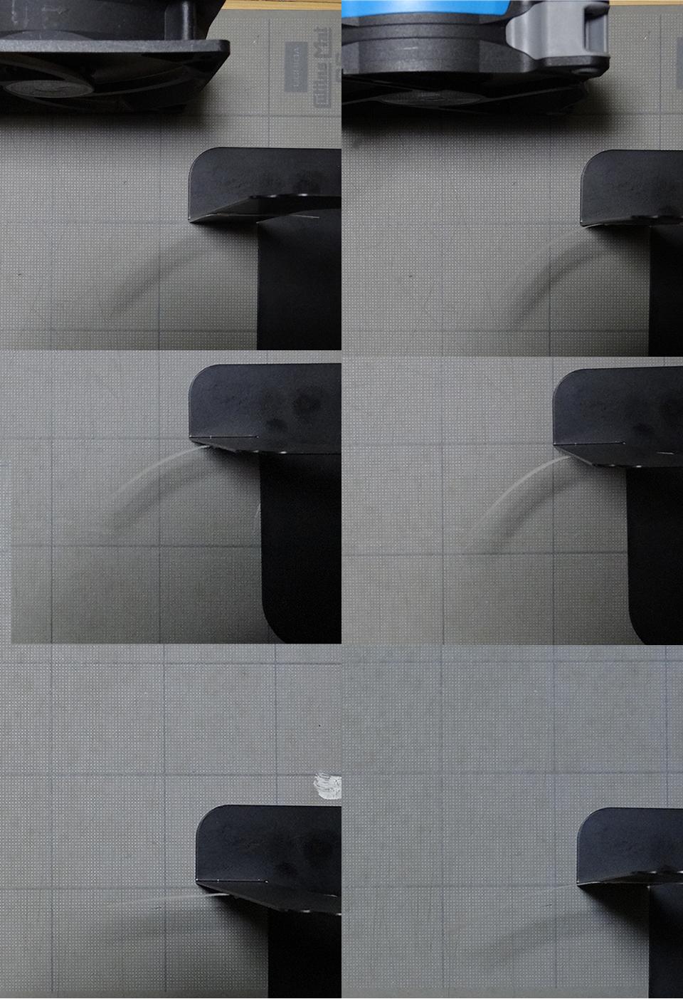 下段:ファンから35cmの距離で撮影。左は風を感じる程度でブレブレ、右のSP120 HIGH PERFORMANCE EDITIONはまだまだしっかり押さえつけています