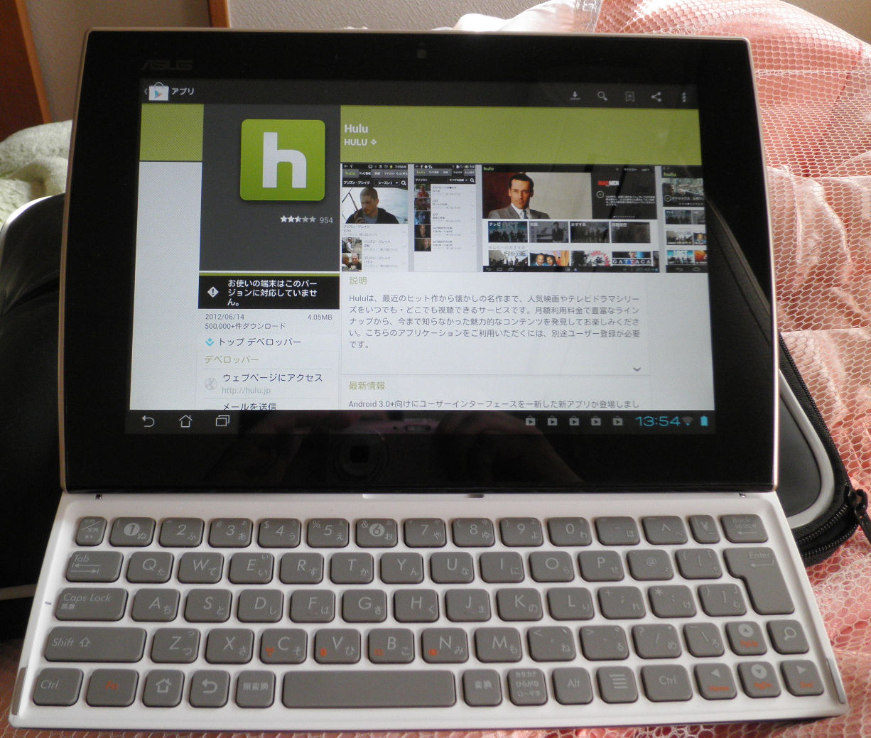 最近 Huluと言う月額980円で、映画や海外ドラマ・ドキメンタリー他を見放題出来るサービスに契約したけど、(要ネット回線)メインPC ノートPCで見るには画面大きいのは良いけど、寝ながら見るにはちょっと操作他がし難いので、姉のAndroid4.0.3搭載端末 ASUS EeePad (NVIDAD TEGRA2・ハードウェアキーボード搭載)でHuluを寝ながら見ようと思ったけど、標準装備ブラウザーでも見れなかった+Google Play ストアーでダウンロードしようとしたけど、この機種には対応してませんとメッセージが出て、インストール出来なかった。