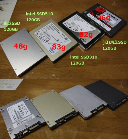 ガワの材質がとてもペラペラ(といっても多少の衝撃には差し支えないレベルだが)というのもあり、NANDフラッシュの大容量化が進みチップ数が減ったので(おそらく32GB*4枚+コントローラ+DRAM)こんなに軽いんだろう。まぁ一番の原因はガワが無駄に軽い素材というところな気がするが。それこそ自作erをメインターゲットにしているintelなどと比べておそらく組み込み向けな東芝なので、SSD本体の耐久性はさほど気にする程ではないということなのだろうか。