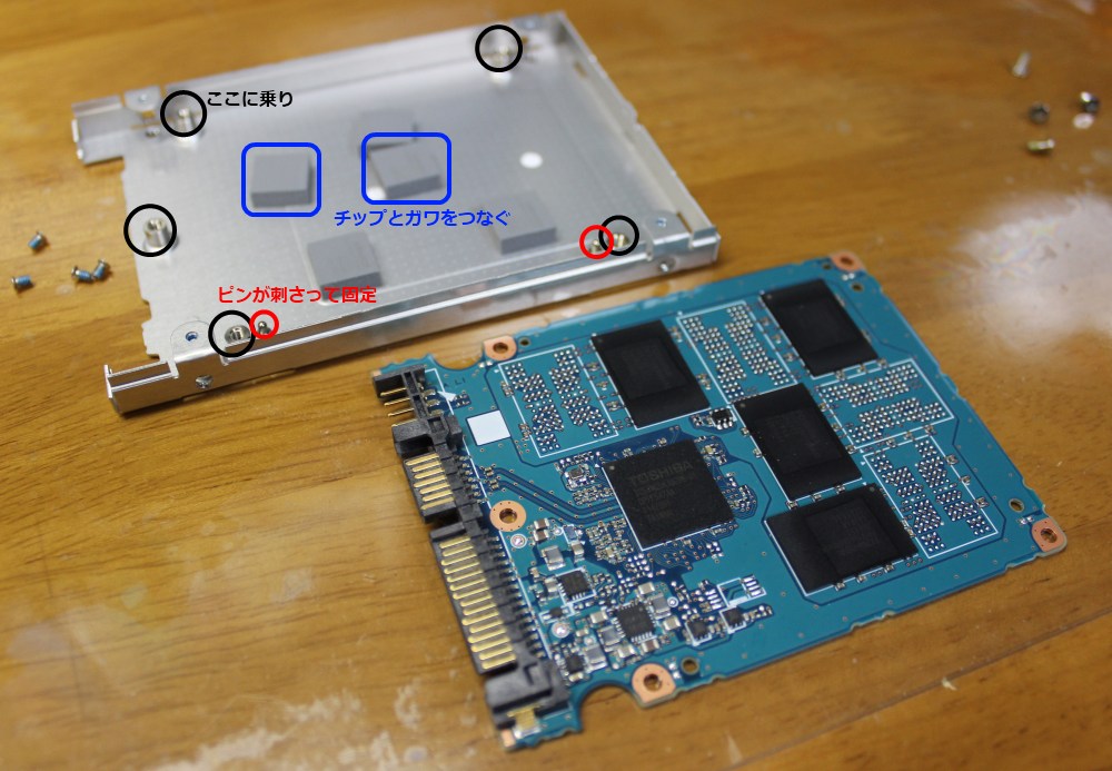 薄いガワはサーマルパッドでチップと接触しており、ヒートシンクの役目も果たしている。どうりで他のSSDは冬でも冷たいくらいだったのに、このSSDはほんわかあったかいわけだ。