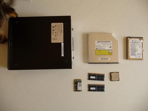 家にあるパーツ群です。メモリ、BDドライブ(tx2から取り外してしまいました。tx2にはもともと付いてたDVDマルチを)無線LANカード、メモリ、320GB2.5インチHDD、買ったCPU。