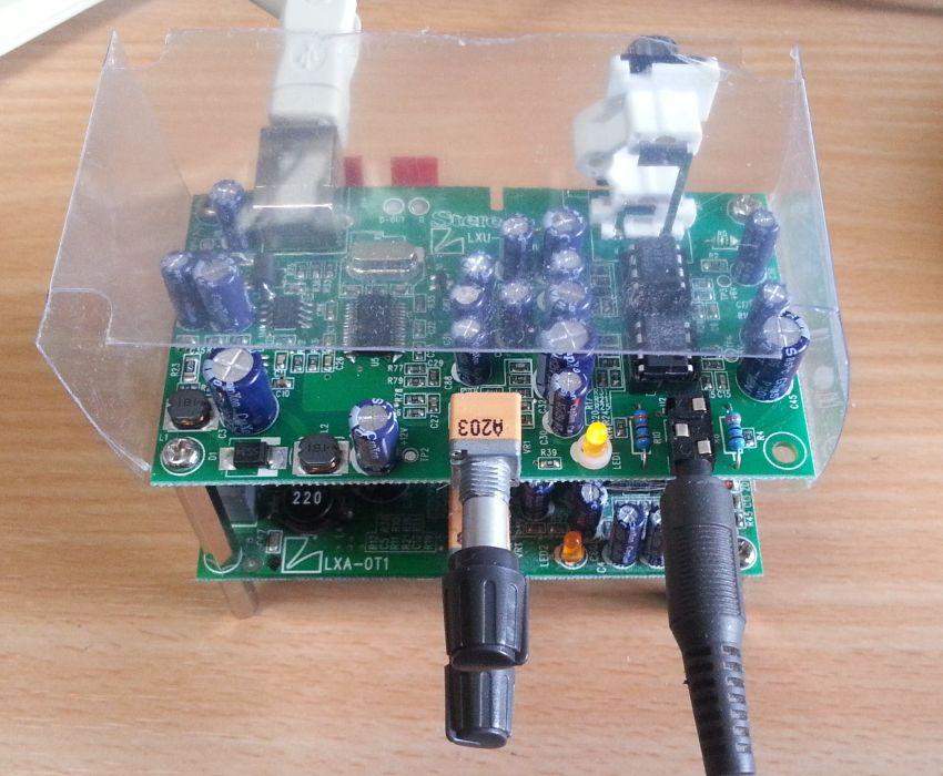 LXA-0T1とスタックしてみたんですが、スペーサーの高さがスピーカー端子より低いために、ねじ込むと基板がたわみます。仕方ないので緩く取り付けています。