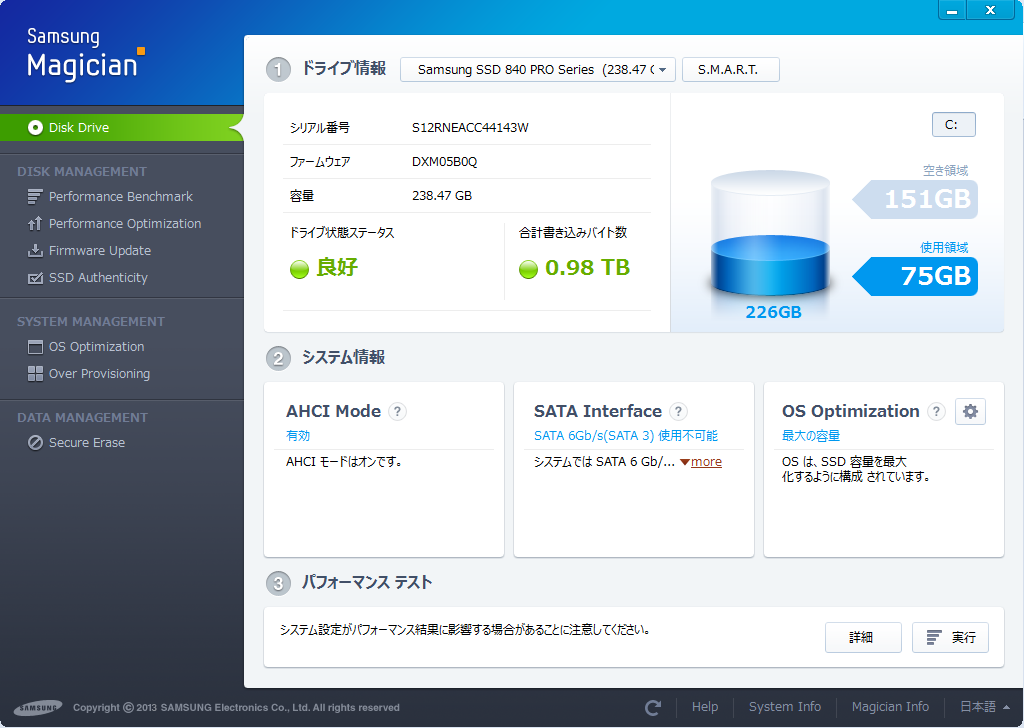 Samsung Magicianのバージョンを4.0から4.1に上げることによって、ツールの日本語化が可能になりました。(少し微妙な言い回しがありますが(^_^;))