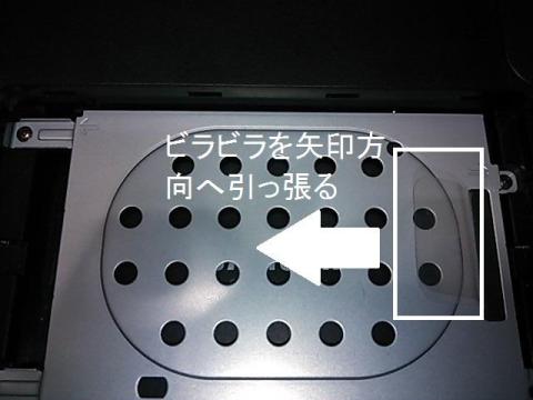 ビラビラのセロハンみたいなやつを矢印方向に軽く引っ張って見てください。簡単に留め具を外すことができます。もしできない場合は、少し浮かせてから左側を少し押すと取れやすくなるかも・・・