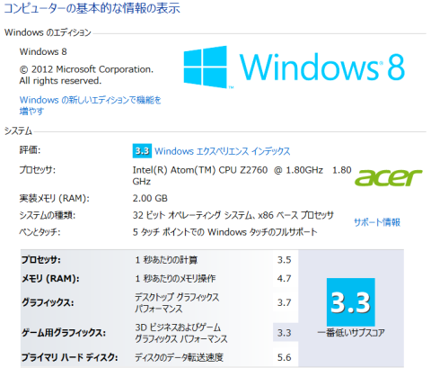 システム構成とエクスペリエンスインデックスからもわかるとおり、すべてにおいてロースペックです。64ビットではなく、HyperVが使えませんが、この性能で仮想マシンを動かすのも非現実的なので問題ないと感じます。