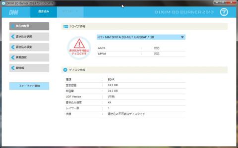 「書き込み不可能なディスクです」と出る。ちなみに、本製品のドライブは松下製のようだ。