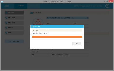 DiXiM BD Burnerのステータスも完了となりテレビ側のプログレスバーも消えます。