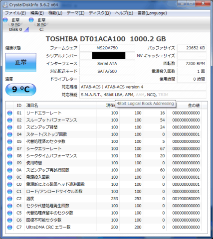 SMARTもしっかりとTOSHIBA名義になっている。帰宅直後に確認したので温度がトンでもない事になっているがこの後部屋あっためました。