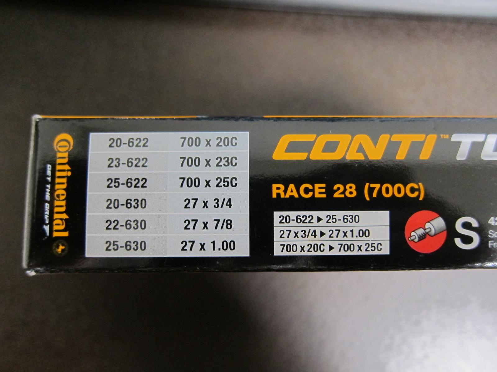 クロスバイクの700x28cのタイヤを700x25cのタイヤに履き替えるために、こちらのチューブを購入しました。クロスバイク用だし超スポーツ走行をするわけでもないので、とにかく安く!って事でコストパフォーマンスを重視しこちらのチューブを選択(当然ラテックスチューブなんて論外)。ディープリム(深いリム)ではないので42mmバルブの製品にしています。 パッケージを見ると、こちらは700x20~25c用ですね。