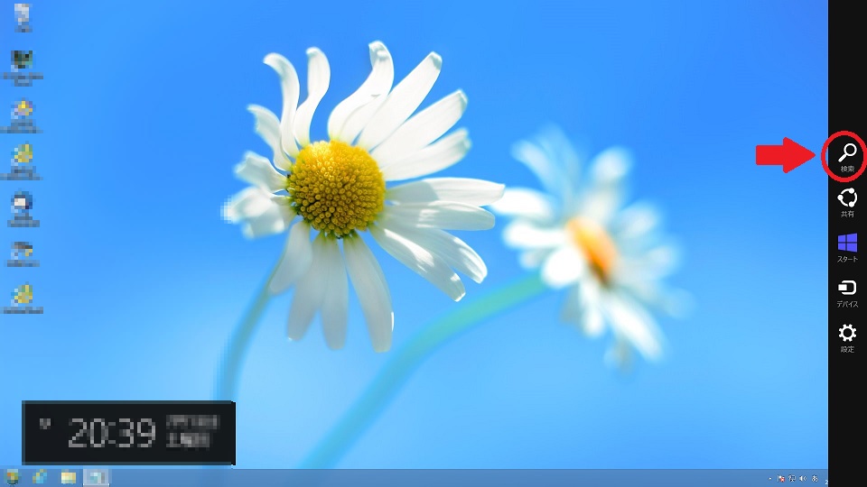 ①メニューバー(チャーム) → 検索 → コントロールパネル