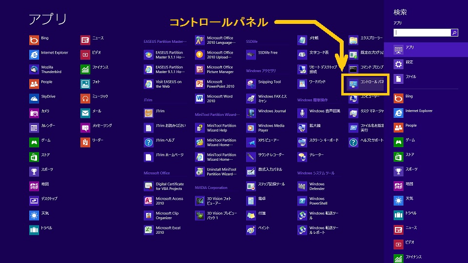・メニューバー(チャーム) → 検索 → コントロールパネル