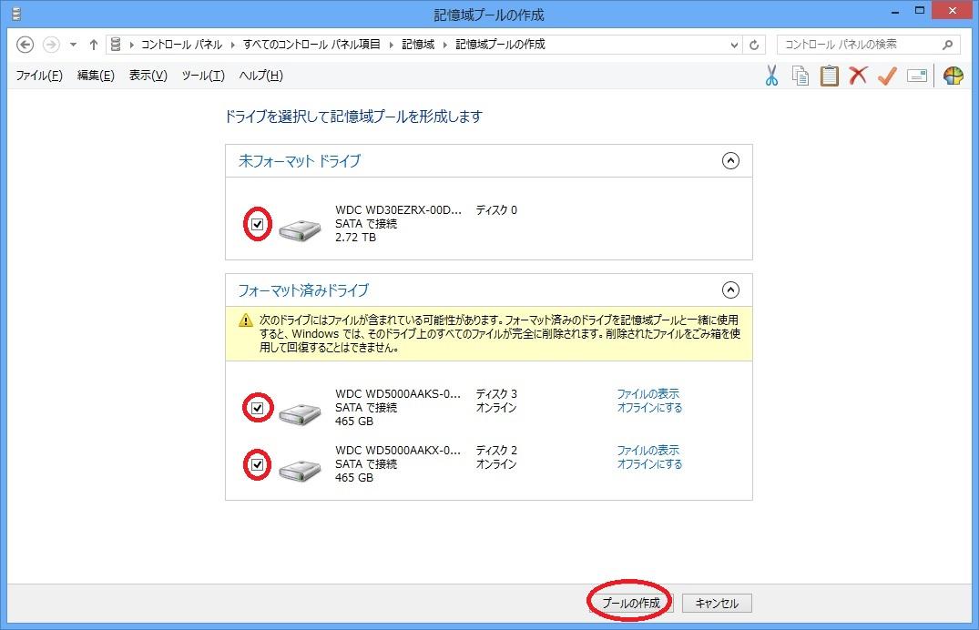 3.記憶域プールに含めるHDDに ✔ を入れてプール作成する。