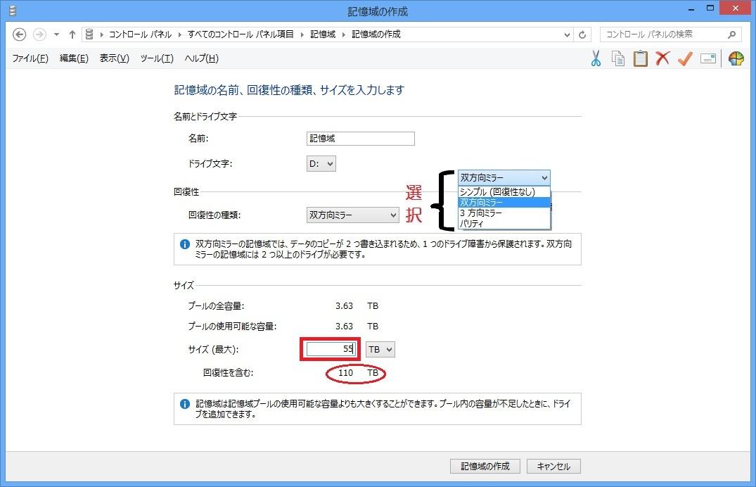 記憶域プールは接続したHDDトータル容量以上に設定できるが、