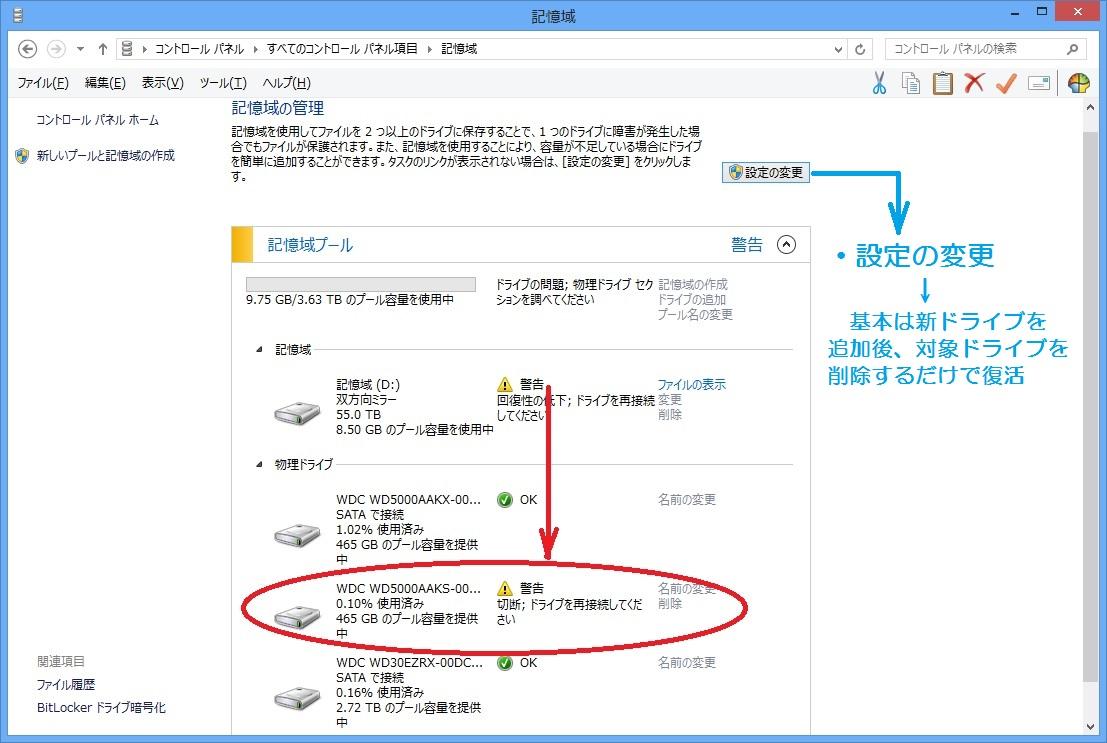 変えてみても、記憶域プールもデーターも設定通り残っている。