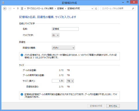 そして、『記憶域の作成』をおして