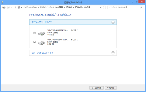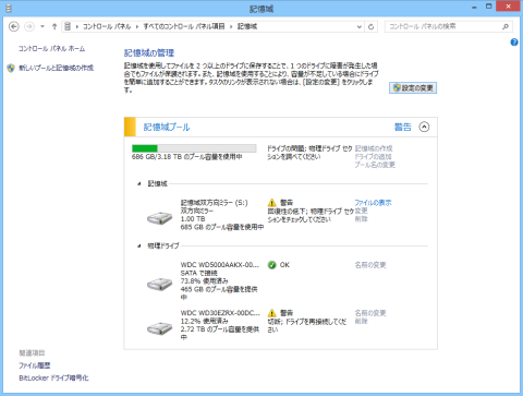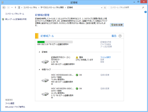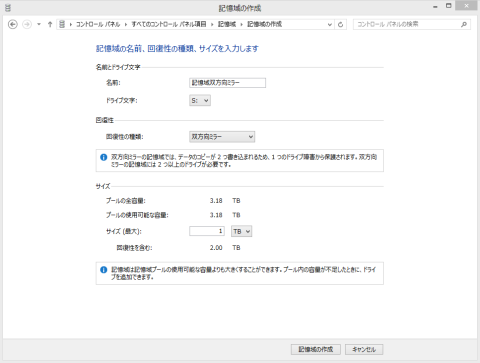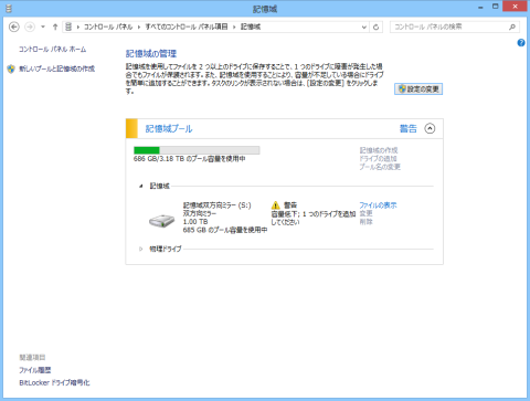 ただ、パリティ記憶域をWindows8で利用する場合、物理HDDは3台までのようです。