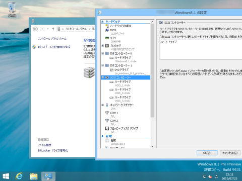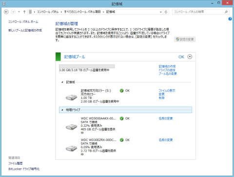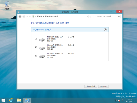 Windows8.1Previewの仮想マシンにWD Green 3TB上に作ったVDHXディスク3つを使って、記憶域プールを作ってみました。