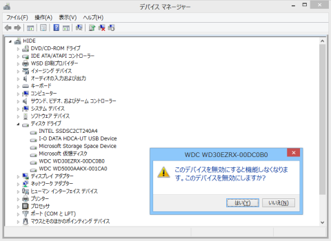 ここで、疑似障害ということで、①の3TB HDDをデバイスマネージャーから無効にします。