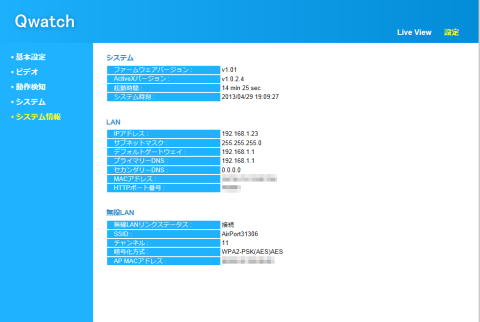 次に、Qwatchの設定画面でシステム情報を確認して問題無いことを確認しました。