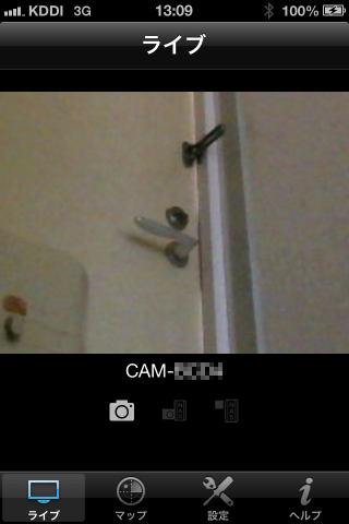 3Gですと接続まで数秒待ちますが、玄関の様子を見ることができました。この状態では鍵の状態がよくわからないので、拡大したところ鍵が掛かっていることが確認できました。今回のレビューで目的とした鍵の確認は無事にできました。