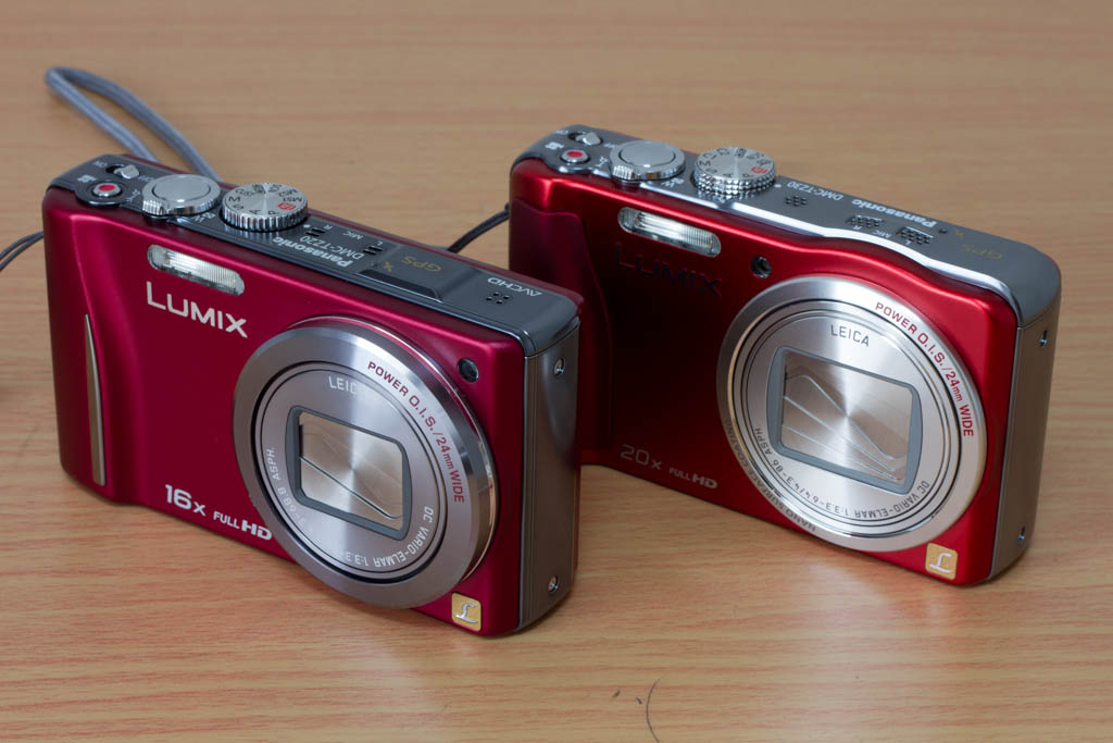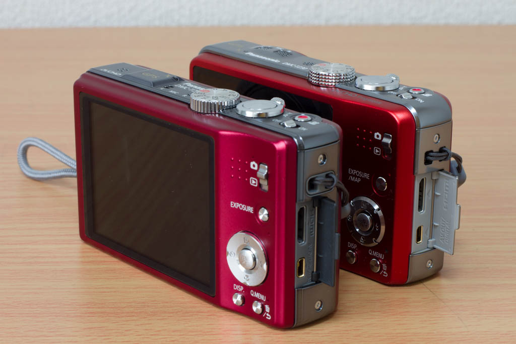TZ20ではGPSがあったところにステレオマイクが配置されています。GPSはどこに行ったかというと、その横の肩の部分にあります。色はTZ20よりも少し明るい感じの赤になっていますが、こうやって比べてもほとんど違いはありません。