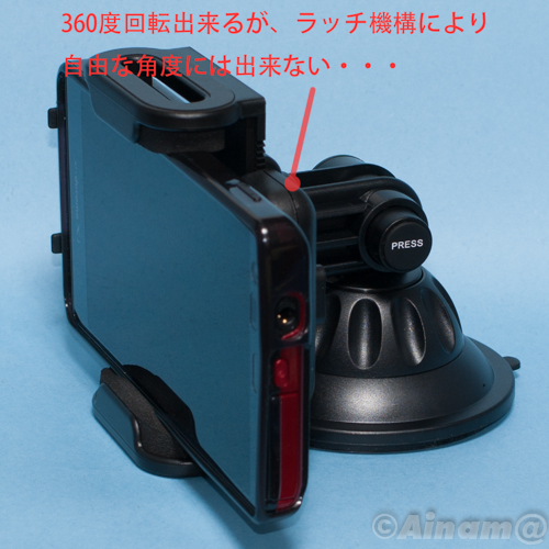 ラッチ機構により、固定出来る角度が決まってます。その為に、微妙な角度に固定出来ないのです。つまり、斜めになったダッシュボードに固定する場合は、画面を水平に固定出来ない可能性があります。